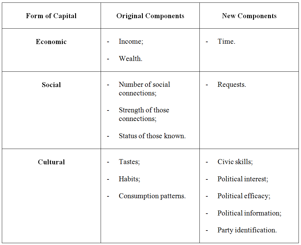 Crucially, the complex relationships between the three forms of capital, and the varying prominence of different types within each form, suggests that perceptions of capital will not be uniform. Different capital has relevance in different contexts and the significance of a certain type or form at a key formative stage of socialisation could influence persistent perceptions. In short, there is the possibility of variance in the relationship between privilege, perception of it, and political participation. This also has the potential to explain the different trends in participation in implicit and explicit political participation because people may perceive those activities, and thus their ability to participate in them, differently.