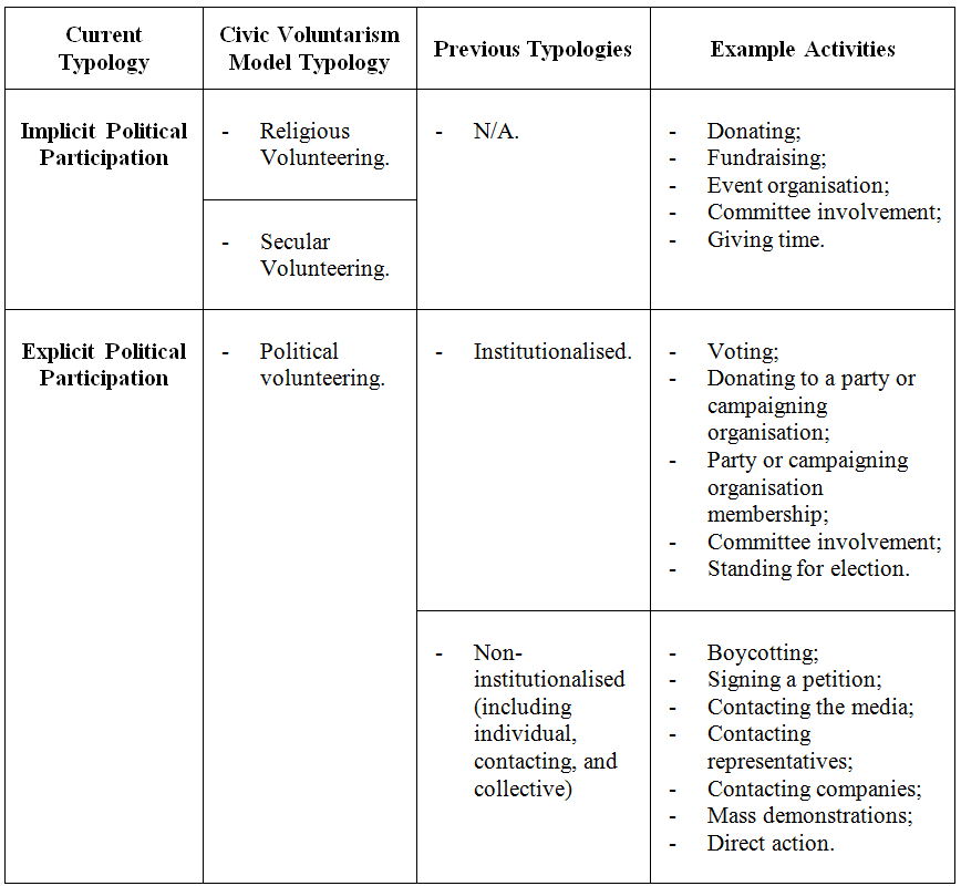 The previously identified distinction between institutionalised and non-institutionalised participation, onto which individual, collective, and contacting modes map, now falls within the domain of explicit political participation. This means that a whole range of activities, from writing a letter to an elected representative to padlocking oneself to the gates of a power station, are encompassed by explicit political participation. Implicit political participation is similarly broad, including as it does all of the secular and religious activities that Verba, Schlozman, and Brady were interested in. As such some modes of implicit political participation are equivalent to modes of explicit political participation and differ only on the basis of the organisation that they relate to. For instance, donating to a charity is considered to be implicit political participation whereas donating to a political party or campaigning organisation is considered to be explicit political participation. Of course, a key defining feature of both explicit and implicit political participation is that they are voluntary, meaning that the current research is not concerned with paid work for any causes. For ease of reference Table 1, presented below, maps Verba, Schlozman, and Brady’s political participation and civic voluntarism onto explicit and implicit political activity alongside previous typologies, and gives examples of each.